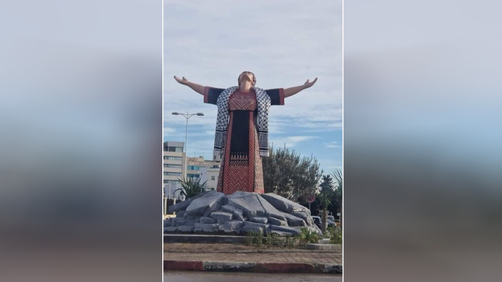 مركز الأخبار ـ في قلب العاصمة التونسية، وتحديداً أمام السفارة الفلسطينية، ارتفعت أيقونة من الريزين المقوى بالحديد، تجسد امرأة فلسطينية شابة مرفوعة الرأس ترتدي الزيّ الغزاوي التقليدي وتلوّح بعلم فلسطين.