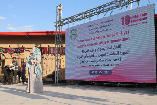 قامشلو - اختتمت فعاليات مهرجان ادب وفن المرأة بنسخته العاشرة اليوم السبت 19 نيسان / ابريل في مدينة قامشلو بإقليم شمال وشرق سوريا، بمشاركة العشرات من النساء منهن الفنانات والنساء اللواتي تتمتعن بمواهب مختلفة، ونُظم المهرجان تحت شعار "الفن الحر بلون وصوت المرأة"، لتسليط الضوء على دور المرأة في المشهد الثقافي الفني، فتضمنت حفل الاختتام بفقرة غنائية للفنانة ياسمين عسكر، وتلاها عرض سينفزيون وتوزيع الجوائز على النساء المشاركات بمواهبهن وصناعاتهن اليدوية.