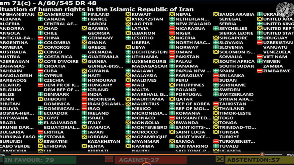 أقرت الجمعية العامة للأمم المتحدة مجدداً قرارها السنوي المتعلق بأوضاع حقوق الإنسان في إيران، حيث حظي القرار بتأييد 78 دولة، في مقابل رفض 27 دولة، فيما امتنعت 64 دولة عن التصويت، وتغيبت 24 أخرى عن المشاركة، ومن بين الدول التي صوتت ضد القرار، روسيا، الصين، بيلاروسيا، كوبا، العراق، باكستان، وإندونيسيا. وتُعد الولايات المتحدة، بريطانيا، إسرائيل، فرنسا، كندا، اليابان، إيطاليا، بلجيكا، النمسا، وأستراليا والسويد من بين الدول التي صوتت لصالح القرار.