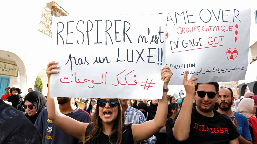 مركز الأخبارـ في ظل تفاقم الأزمة البيئية، تظاهر مئات التونسيين، احتجاجاً على التلوث الناجم عن أنشطة المجمع الكيميائي، وسط ارتفاع في معدلات الامراض التنفسية، وهشاشة العظام والسرطان بسبب الغازات السامة المنبعثة من مصانع الفوسفات.
