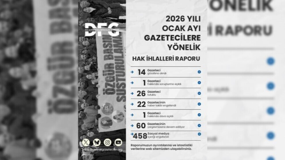 أصدرت جمعية صحفيي دجلة والفرات (DFG) تقريرها عن انتهاكات حقوق الإنسان ضد الصحفيين لشهر كانون الثاني/يناير الفائت، سلط خلاله الضوء على زيادة ملحوظة في الضغوط والانتهاكات التي يتعرض لها الصحفيون، لا سيما في ضوء سياسات الدولة والهجمات على روج آفا.