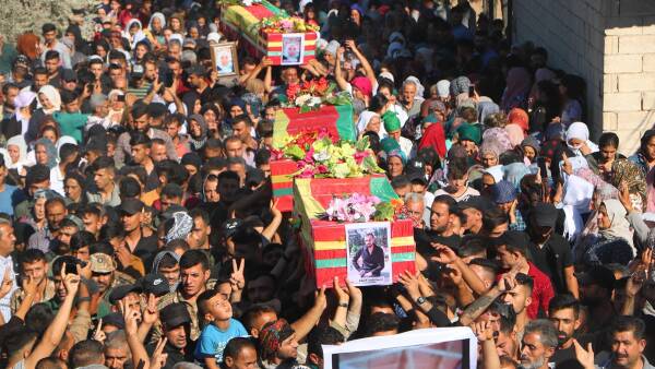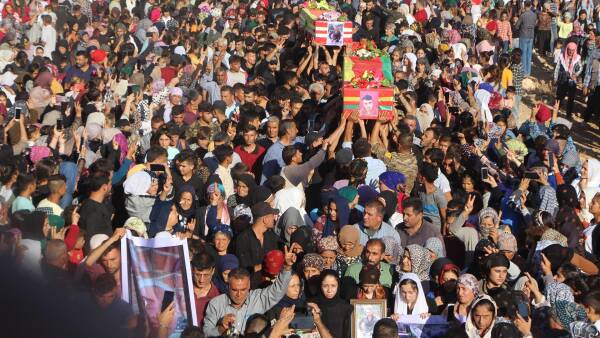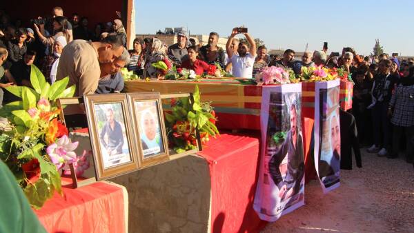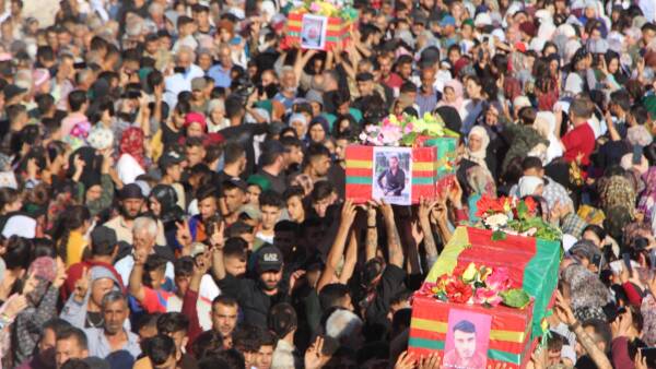 بمراسم مهيبة ومشاركة حاشدة شيع عشرات الآلاف من أهالي عفرين والشهباء شهداء مجزرة تل رفعت الذين لقو حتفهم بقصف طائرات مسيرة للاحتلال التركي.