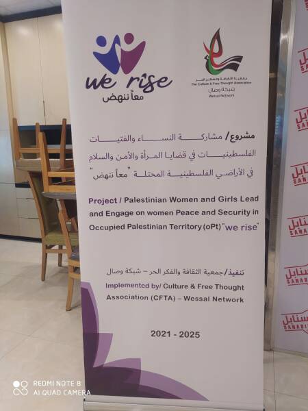 نظمت شبكة وصال التابعة لجمعية الثقافة والفكر الحر لقاء تدريبي بعنوان "مشاركة النساء والفتيات الفلسطينيات في قضايا المرأة والأمن والسلام في الأراضي الفلسطينية المحتلة (معاً ننهض)"