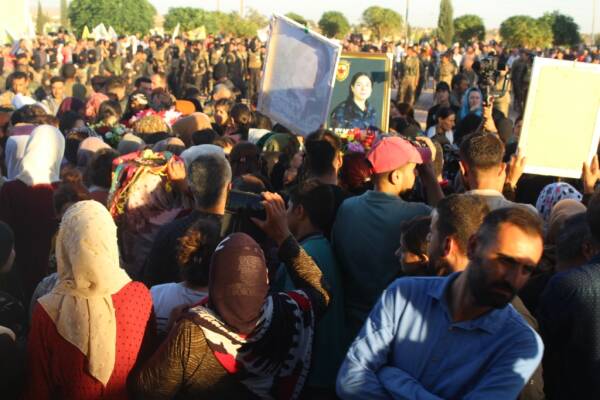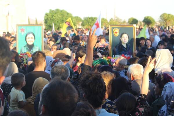 Hasakah- SDF and YPJ commanders Jiyan Tolhildan, Roj Xabûr and Barîn Botan, who were targeted and killed by Turkey after attending the Forum on the 10th anniversary of the Women's Revolution in Rojava on July 22, 2022, were laid to rest with the participation of thousands.