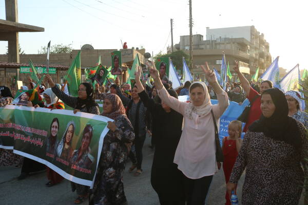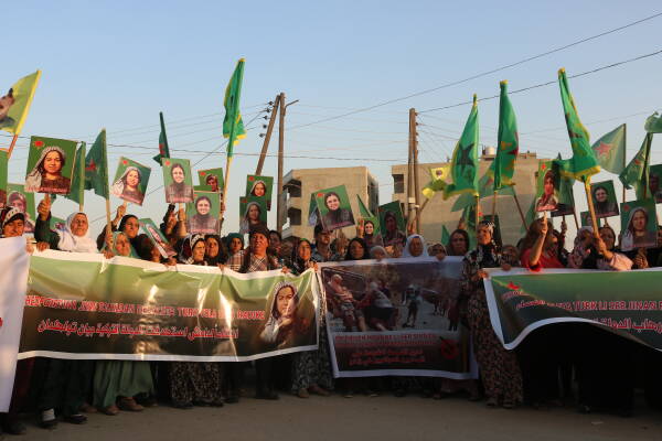 “As women, our stance against the enemy and the fascist Turkish state is clear. The Turkish government targets our project and defeats the women’s revolution and struggle. The revolution that took place here was led by women and thousands of women paid a heavy price while realizing this revolution. Zehra Berkel and her two comrades were killed in the village of Helincê (Halinja) near Kobanê. Hind and Seda Şedad were also killed. On July 22, three female fighters named Jiyan Tolhildan, Roj Xabur andBarin Botan were killed. Lastly, three female members of the security forces were targeted and killed. We will always stand firm and fight by shouting ‘‘jin, Jiyani Azadi (Women, Life, Freedom)’ to give a message to the enemy.”