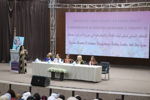 Rihan Loqo said, "We come together today; the aim is not to inherit the ruins, but to rebuild Syria with the hands of women. No constitution can be written without women, no peace can be established without women."