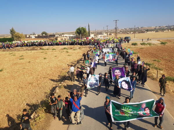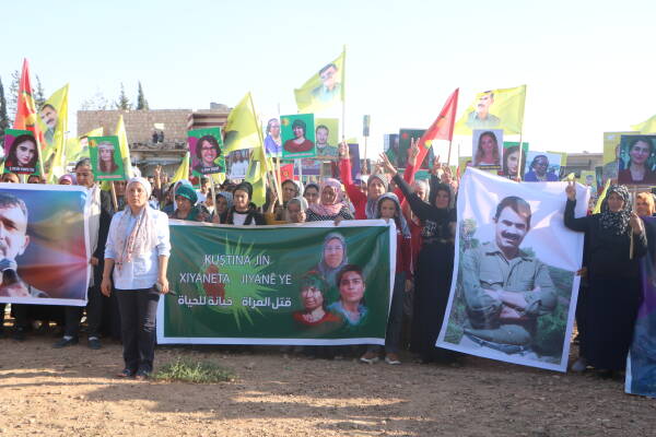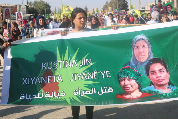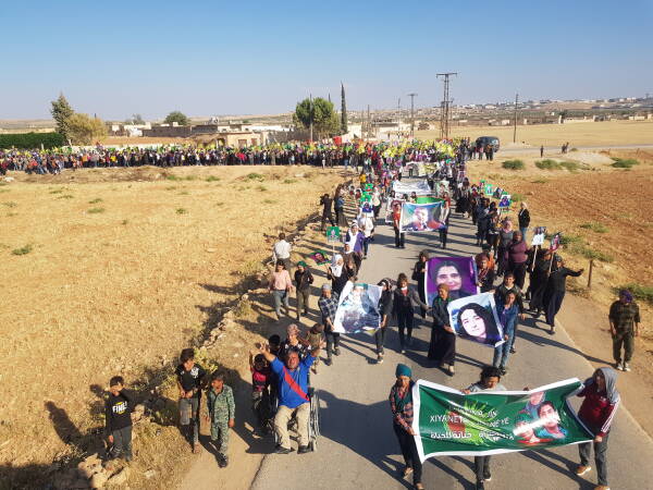 News Center- On June 23, 2020, Turkish drones targeted three women politicians in the Helincê (Halinja) village of Kobanê. Kongra Star Coordination member Zehra Berkel, Kongra Star Assembly member Hebun Xelil and Emine Weysi were killed in the Turkish airstrike. Afrin Region Konra Star office held a mass march in the memory of killed three women with the motto, “Killing a woman is a betrayal of life” with the participation of women from Afrin, Shahba and women working for the organizations and institutions affiliated to the Autonomous Administration of North and East Syria.