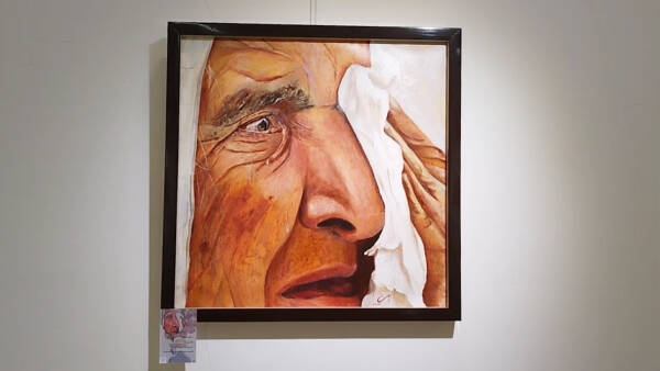 او با لحنی تأملآمیز ادامه میدهد: «هرکاری که تمام میشد، با وسواسی تمام در مقابل آن مینشستم و ساعتها فکر میکردم تا ببینم چه چیزی به تصویر میآید و چه پیامی میتواند منتقل شود. به عنوان مثال در یکی از تابلوها، زنی با روسری سفید دیده میشود. در نگاه خستهاش جهان میلرزد، اما روسری سفیدش پرچم تسلیم نیست؛ نشانه صبری است که تا عمقِ درد ریشه دوانده است. هر تابلو برای من مانند زنی است که داستانی ناگفته دارد و من تنها میتوانم آن را بازگو کنم.»