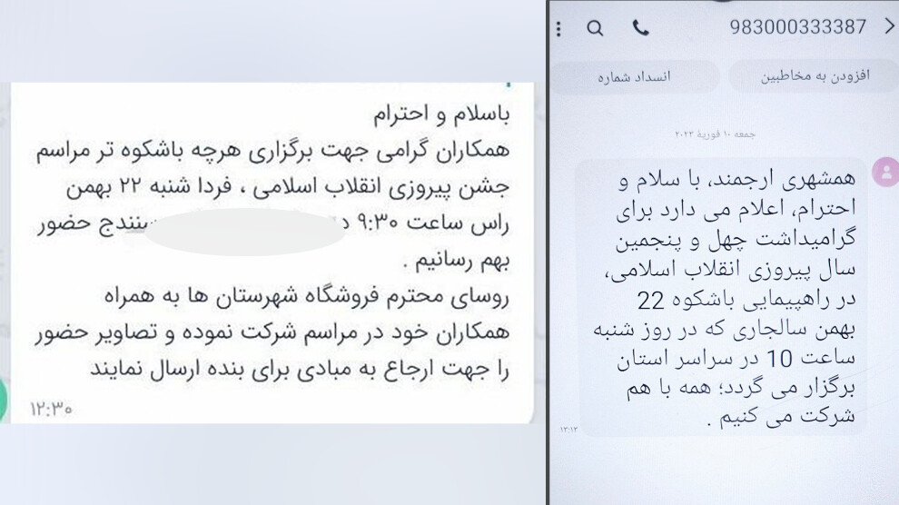 پیامک‌هایی برای تشویق بە مشارکت در مراسم حکومتی ٢٢ بهمن بە مردم ارسال شدە است و کارمندان و دانش آموزان نیز تهدید بە اخراج شدەاند.