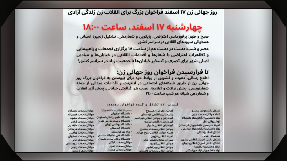 مرکز خبر - ۵٢ تشکل و گروه انقلابی برای گردهمایی اعتراضی و انقلابی در ١٧ اسفند مصادف با ٨ مارس روز جهانی زن، فراخوانی منتشر نمودند.