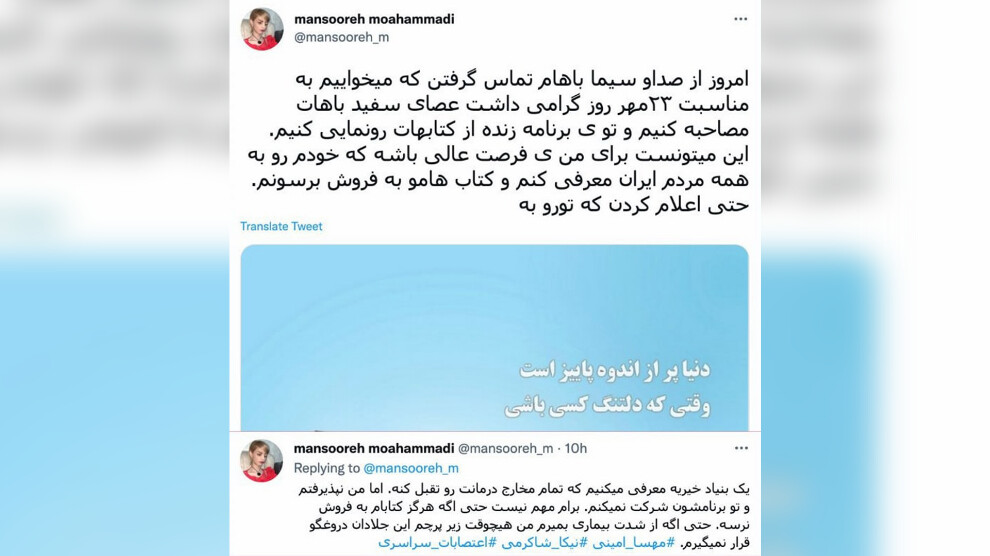 منصوره محمدی، شاعر روشندل لرستانی در حساب شخصی خود در توییتر نوشت که از مصاحبه و حضور در صدا و سیمای جمهوری اسلامی خودداری کرده است.