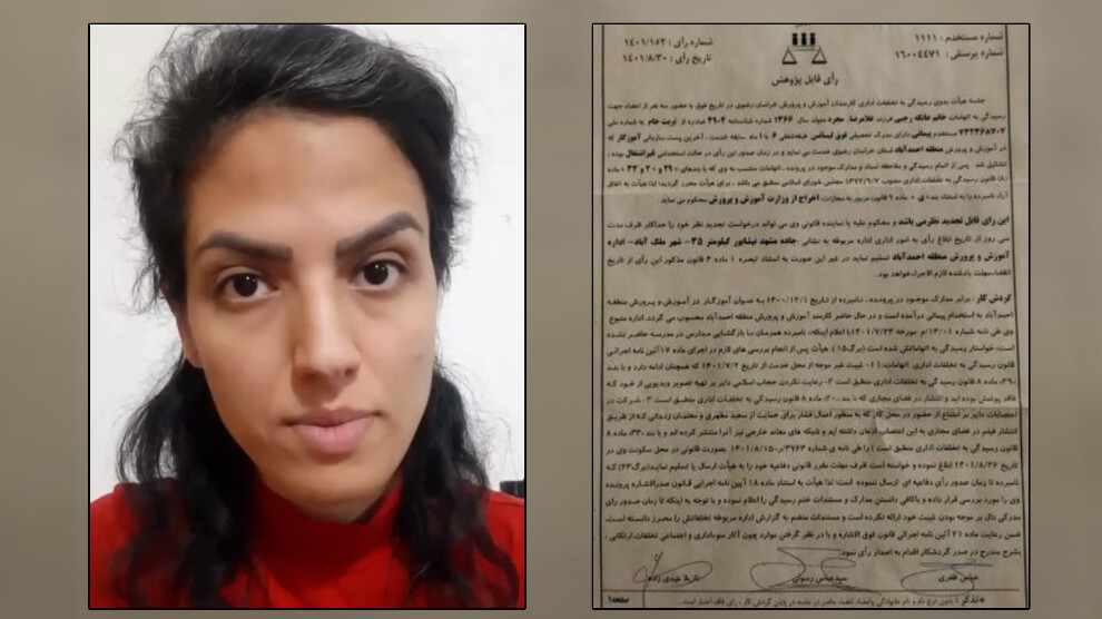 مرکز خبر- امروز پنجشنبه ١۵ دیماه، عاتکه رجبی، معلم دبستان ابوذر مشهد که در جریان اعتراضات سراسری در ایران و پس از انتشار ویدیویی حمایتی از دانشآموزان و معلمان بازداشت شده و بدون حجاب اجباری بازداشت و از شغلش تعلیق شده بود، در واکنش به حکم تعلیق خود در نامهای که از سوی شورای هماهنگی تشکهای صنفی فرهنگیان منتشر شده است نوشت: «نه جانم شما بنده را اخراج نکردید بلکه بنده حاضر به همکاری با شما نشدم چرا که خیلی زود متوجه شدم سازمان آموزش و پرورش نه تنها با مردم نیست بلکه ضد مردمیترین سازمانی است که میشناسم. شما اصل سی قانون اساسی را نادیده گرفتهاید و این یعنی تمامی دانشآموزانی که زیر نظر شما تحصیل کردهاند از حق قانونی خود محروم ماندهاند».