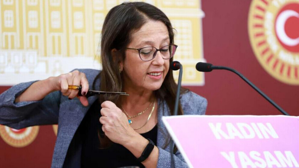 اویا ارسوی نماینده‌ی حزب دموکراتیک خلق‌ها (HDP)، در یک کنفرانس مطبوعاتی در پارلمان ترکیە، برای ژینا امینی و دیگر زنان کشته شده در قیام خلق‌های ایران موهای خود را کوتاه کرد.