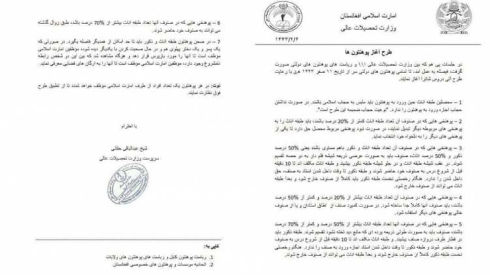 در تاریخ ۲۳ شهریور طالبان در مورد حضور زنان در دانشگاه و دانشکدهها بخشنامهی جدیدی صادر کرده است.
