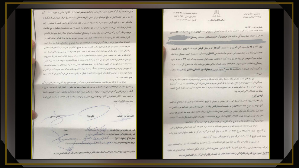 بر اساس گزارش منتشر شدە، مریم زیرک، آموزگار مقطع ابتدایی قزوین، توسط هیئت بدوی رسیدگی به تخلفات اداری با دستور مدیر کل آموزش و پرورش استان قزوین، به اتهام شرکت در تجمعات فرهنگیان به «بازنشستگی اجباری با تقلیل یک گروه» محکوم شد.