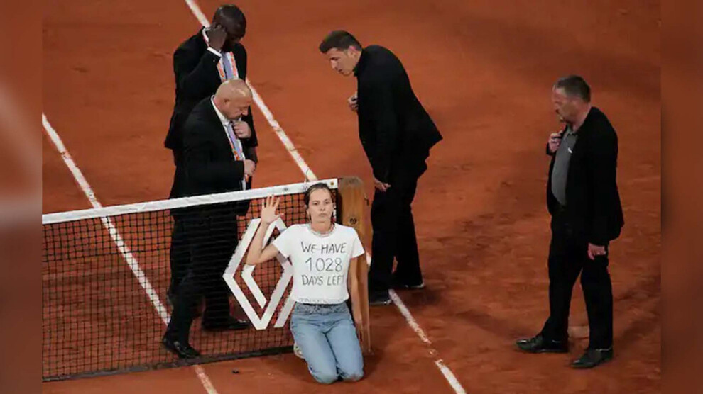 مرکز خبر- بە گزارش خبرگزاری زن، روز جمعه ٣ ژوئن ٢٠٢٢، در مسابقات نیمه نهایی تنیس آزاد فرانسە و در میانههای بازی یک فعال محیط زیست در اعتراض بە وضعیت بحرانی محیط زیست بە زمین بازی رفت، خود را به تور بست و مسابقه را بە مدت ١۵ دقیقه متوقف کرد.