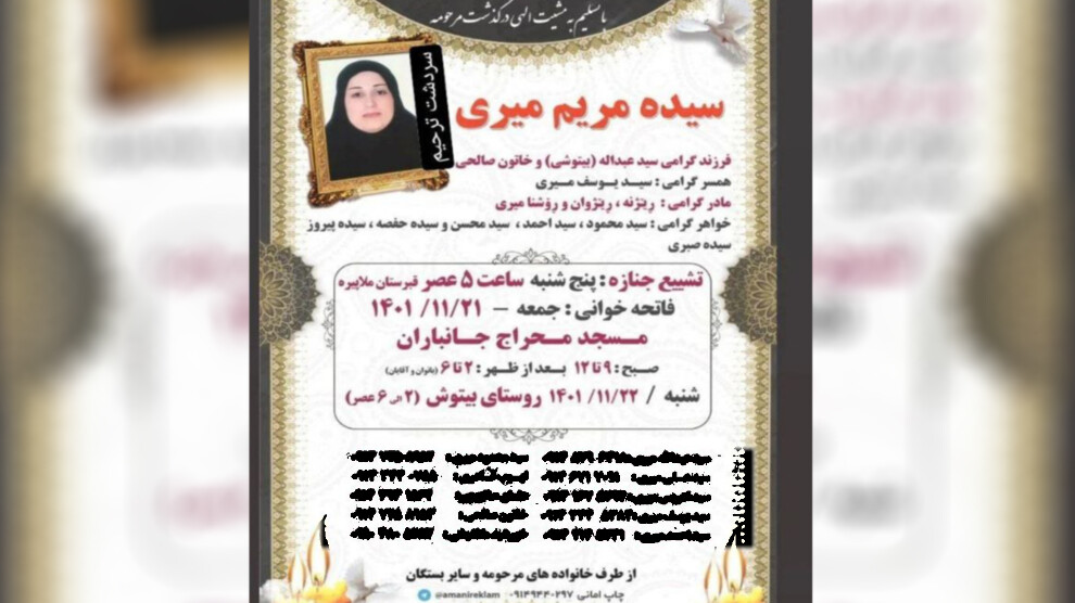 سردشت - مریم میری ٣۵ ساله اهل روستای بیتوش سردشت و مادر سه فرزند کە چهارمین فرزندش را باردار بوده است، در طول بارداری تحت نظر خ.ا. متخصص زنان بوده است. او روز پنجشنبە در بیمارستان سردشت تحت عمل سزارین قرار گرفتە است و خانوادەی او مدعی هستند کە بە دلیل خطای پزشکی جان خود را حین سزارین از دست دادە است.