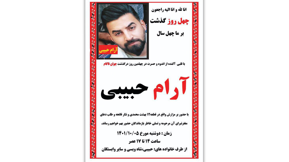 در این اطلاعیە با تاکید بر اینکە چهل روزی کە گذشت برای آنها چهل سال بودە، آمدە است: با قلبی آکندە از اندوە و حسرت در چهلمین روز درگذشت جوان ناکام آرام حبیبی با حضور در مزارش واقع در قطعە ١٢ بشهت محمدی و نثار فاتحە و طلب دعای مغفرت برای آن مرحوم و تسلی خاطر بازماندگان حضور بهم خواهیم رساند.