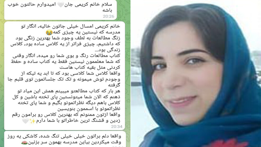 یک دانشآموز اهل سنه در نامهای از غیبت نسرین کریمی، معلم خود که به دلیل فعالیت صنفی به بازنشستگی اجباری محکوم شده، ابراز اندوه کرد.