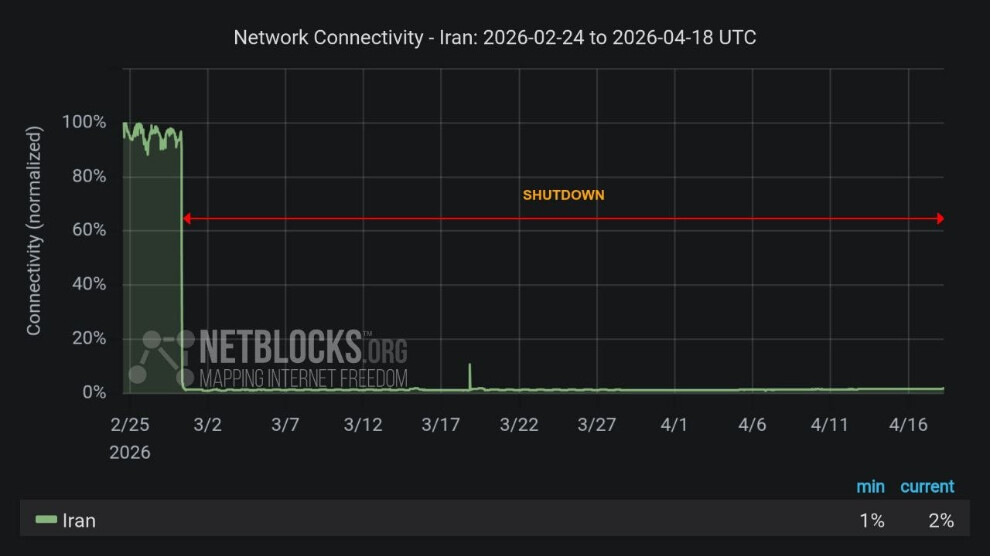 مرکز خبر- امروز شنبه ۲۹ فروردینماه، نتبلاکس، سازمان ناظر بر دسترسی به اینترنت، اعلام کرد، این خاموشی دیجیتال بیش از ۱۱۷۰ ساعت ادامه یافته و ایران را به یکی از طولانیترین موارد قطع اینترنت در سطح ملی تبدیل کرده است. همچنین سطح دسترسی به اینترنت در این مدت بهشدت کاهش یافته و در برخی برآوردها تنها به چند درصد از حالت عادی رسیده است.