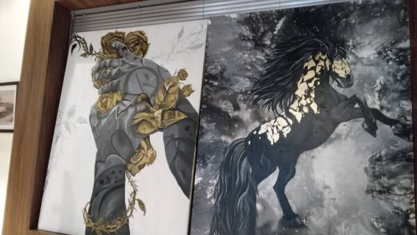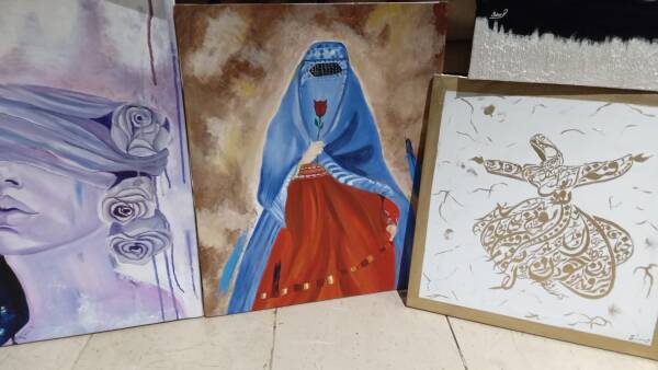 در نمایشگاه در کنار صنایع دستی افغانستان نقاشی و رسامیهای زیاد به چشم میخورد که توسط زنان به تصویر کشیده شده و بیان کنندهای خشونت و مقاومت زنان افغان میباشد. بنا ما با صوفیا نادری که در گوشه از تالار نقاشیهایش را به نمایش گذاشته بود. هم کلام شدیم: «نمایشگاه برای چهار روز است و من تابلوهای نقاشی خود را به نمایش گذاشته ام.»