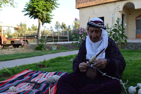 Xezala El- Mutleq destnîşan kir li ser pîşeya xwe ya ristina hiriyê û jê çêkirina amûrên jiyanê û wiha domand: “Di temenê 14 saliya xwe de dayika min min fêrî ristina hiriyê kir. Ji xwe tayên me yan ristinê jî ji hiriya pezê me bû. Di demsala biharê de me hiriya bez radikir û li ber kaniyan baş dişûşt û paşê me zûha dikir û dikir tayê ristinê. Amûrên ku me pê kar jî dikir weke teşî, şehê hiriyê û qoçê xezalan a hemû ji afrîneyên me bûn. Di salê de me hêjmareke amûrên hiriyê yên wek  sicda, çenta, tevn û gelek amûrên ku çanda me zindî dike çêdikirin. Berhemên me piranî li welatên Ereban weke Erebistana Sûdiyê dihatin firotin. Min piştî xwe 8 nifişan fêrî ristina hiriyê kir û niha zarokên min û neviyên min hemû di vî karî de pispor in. Li kêleka wê jî me ji mûyê bizinan konê xwe çêdikirin û li deştan me jiyana xwe bi xwezayê re diqedand.  Her wiha me ji çermê bizinan meşk çêdikirin û jê me nivîşkê esîl û rûnê Erebî radikir. Ango ez dikarim bêjim jiyana me hemû bi keda destê me bû.”