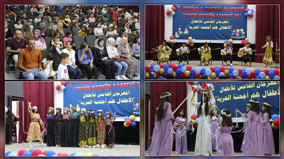 Di vê çarçoveyê de îro 5`emîn Festîvala Zarokan di bin dirûşma "Zarok baskên azadiyê ne" bi amadebûna 21 komên govend, şano, helbest û stranan ên ji kantona Kobanê, Sirîn, Minbic, Tebqa û Reqayê hat lidarxistin.