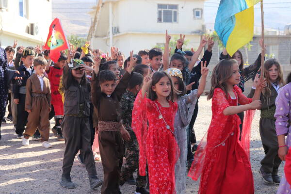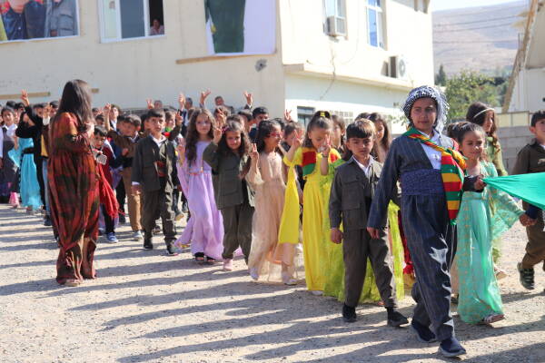 Danê siharê xwendevanên dibistanên sereteyî, navîn û amadeyî bi awayek fermî bi cil û bergên xwe yên Kurdî û bi alên xwe berê xwe dan qada Navenda Çand û Hunera Mexmûrê.