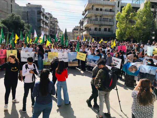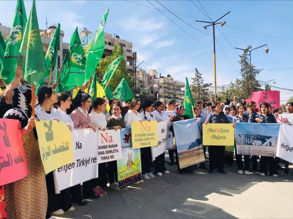 Qamişlo – Şêniyên Qamişlo li pêşiya nûnertiya Neteweyên Yekbûyî ya li bajarê Qamişlo ya Bakur û Rojhilatê Sûriyeyê xwepêşandanek li dar xistin. Ji hemû pêkhateyan şêniyên bajêr, sazî û dezgehên Rêveberiya Xweser, şagirt û xwendevan bi rakirina panelên ku kiryarên Tirkiye eşkere dike tev pankartên “Na ji bombe barankirina Tirkiyê re. Na ji dagirkeriya Tirkiyê re” beşdarî xwepêşandanê bûn.