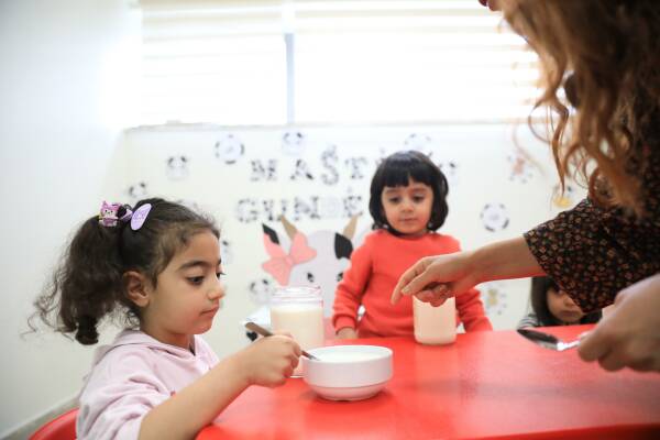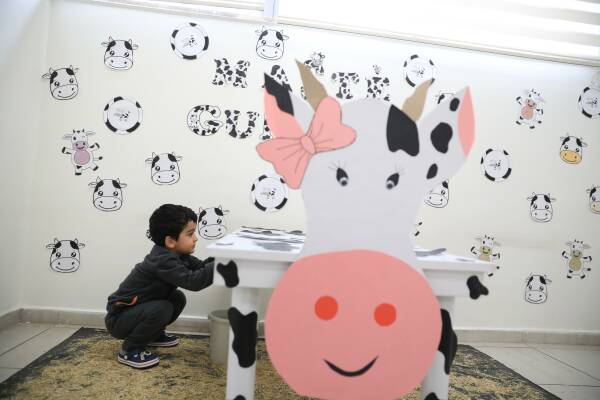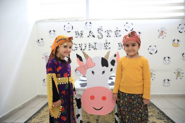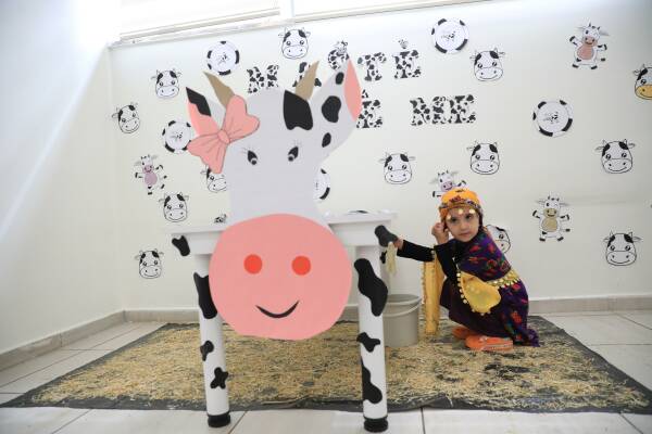 Zarokên li Zarokîstana Perperîkê ya Amedê, bi modêla Montessorî çêlek dotin û haveynkirina şîr fêr bûn.