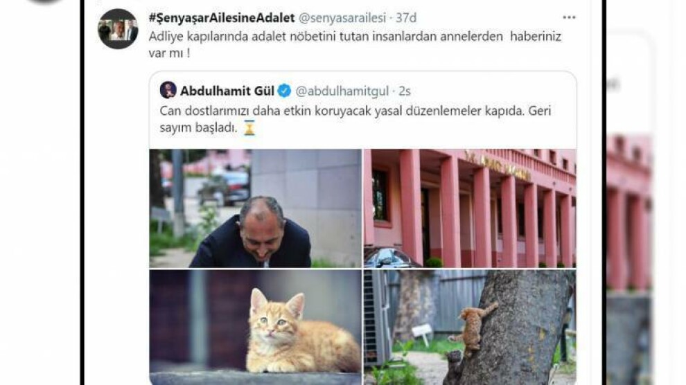 Malbatê li ser hesabê xwe yê medya ya civakî hesabên twîtterê yên Wezîrê Dadê Abdulhamît Gul, Wezareta Dadê û Walîtiya Rihayê yên fermî nîşan kir û ev parvekirin kir: “Li Meclîsê parlamenterekî destê xwe radike û datîne (Îbrahîm Halîl Yildiz) heye! Mantiqa 'dozger bi her awayî di destê me de ne, kes nikare dest me bide' ev sê sal e li Rihayê tê sepandin. Li Nexweşxaneya dewletê komkujî heye!”