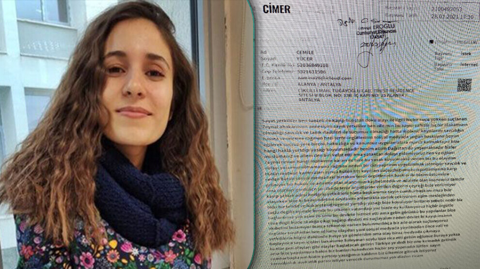 Beriya niha nivîsek ku Cemîle Yucer dayika Zaînal Abarakov ê ku gumanbarê sereke û hevalê mêr a berê ya Gulistan Doku herî dawî hevdîtin kir, ji Navenda Ragihandinê ya Serokomariyê (CÎMER) re nivîsand, bibû rojev. Cemîle Yucer, di daxwaznameya xwe de diyar kir kurê xwe Zaînal Abakarov bi agahiya Waliyê wê demê yê Tunceliyê Tuncay Sonel û rayedarên din şand Rûsyayê û piştî ku ev bûyer di çapemeniyê de dest pê kir, wezîrê hundir Suleyman Soylu ji me re got, “bila kurê we were vir, an na dê ew bûyerên wekî Geziyê bidin destpêkirin”, kurê xwe dîsa vegerandiye.