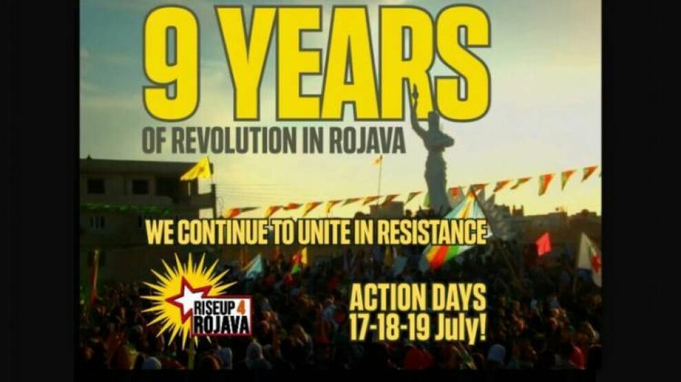 Navenda Nûçeyan - Kampanya RiseUp4Rojava, Komîna Enternasyonalîst a Rojava û Jinên Ciwan ên Enternasyonalîst ji bo 9’emîn salvegera 19'ê Tîrmehê Şoreşa Rojava daxuyaniyeke hevar dan. Di daxuyaniyê de ji bo êrîşên dewleta tirk ên li ser Kurdistanê ev tişt hatin gotin: “Çawa ku em 2014‘an dema Kobanê, 2018 dema Efrînê û 2019‘an di dema Serêkaniyê de derketin kolanan, îro jî divê em li kêleka gerîla cih bigirin û li hemberî faşîzmê li herderê têkoşîna xwe bilind bikin.''