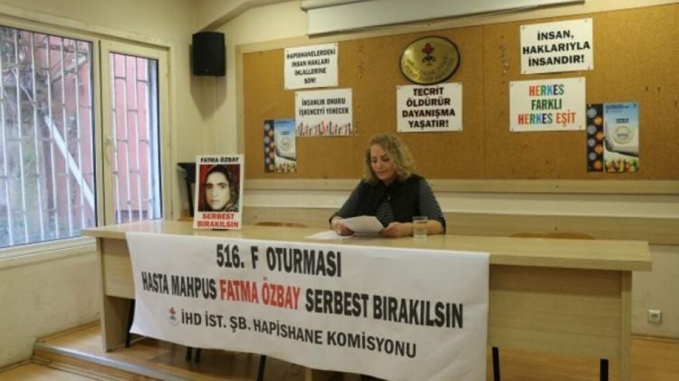Stenbol - Komîsyona Girtîhan a Şaxa Komeleya Mafên Mirovan (ÎHD) a Stenbolê, ji bo ku balê bikişînin ser rewşa girtiyên nexweş, her hefteyê çalakiya “Rûniştina F” dikin. Çalakiya hefteya 516’emîn jî li pêşiya avahiya komeleyê hat kirin. Di rûniştina vê hefteyê de bal kişandin ser girtiya nexweş Fatma Ozbay a 56 salî ku 24 sal in di girtîgehê de ye.