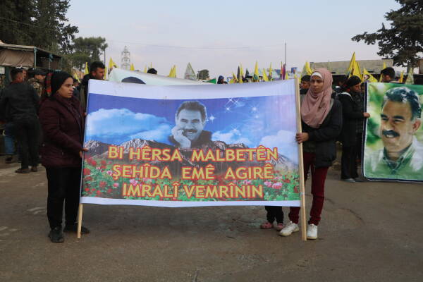 Meclisa Malbatên Şehîdan a herêma Efrîn-Şehbayê ji bo zanîna rewşa Rêberê Gelê Kurd Abdullah Ocalan meşek li dar xist.
