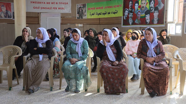 Endama Meclisa Gel Nahîda Xelîl wiha got: “ Îro civîn ji bo rewşa jin hatiye lidarxistin. Ji ber ku jin bê maf hatiye hiştin, tenê di mal de bû û bi karên malê ve mijûl dibû û sînor ji jinê re hatibûn dayîn. Jin her dem kêm dihate dîtin. Lê belê pêwîste jin xwe kêm nebîne. Rewşa jin berê pir xirab bû, lê belê niha piştî naskirina fikirê Rêber Apo jina Êzidî her karî dike û pêşengtiyê dike. Ji bo wê jî pêwîste jin zilmê û zextê li ser xwe qebûl neke û ser bilind be.”