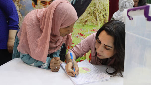 Ji seat 10’ê sibehê de jinên ji pêkhateyên Kurd û Ereb ji temenên 18 salî ber bi 100 salî ve bi coşeke mezin û bi berzkirina dirûşmên “jin, jiyan, azadî” berê xwe didin sindoqan û dengê xwe didin.