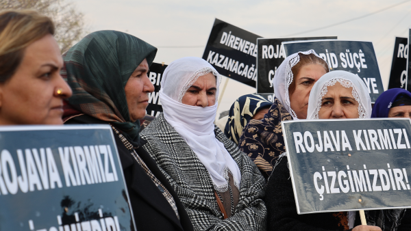 Riha – Li dijî êrişên li ser Bakur Rojhilatê Sûriyeyê, bi sedan kesên ku çûn Pirsûsa Rihayê ku li hemberî Kobanê ye, bertek nîşanî êrişan dan. Bi sedan kes, tevî astengiyan polîsan jî meşiyan. Jinên ku beşdarî çalakiyê bûn, daxwazên xwe anîn ziman û xwestin di navbera Kurdan de demek zû yekitî çêbibe.
