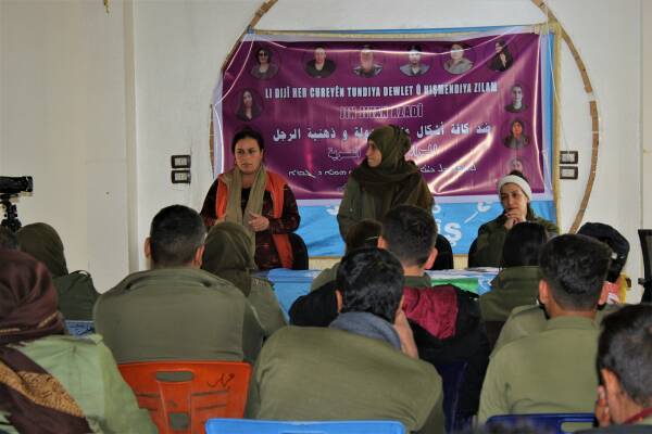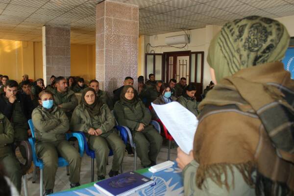 Kongra Star li ser bingehê rêzeçalakiyên xwe yên 25’ê Mijdarê de ji bo endamên Hêzên Ewlekariya Hundirîn a Til Temirê li ser tundiya ku her roj û kêlî jin pêre rû bi rû dimîne semîner da.
