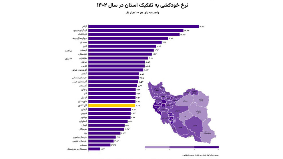 Danayên li gorî parêzgehan, nîşan dide ku rewşa li rojavayê Îranê, li gorî herêmên navîn û rojhilatê welat zêdetir krîtîktir e. Îlam, xwedî rêjeya herî bilind a xwekuştinê ya li Îranê ye û di sala 2023’an de ji her 100 hezar kesan 16.8 bûyer hate tomar kirin.