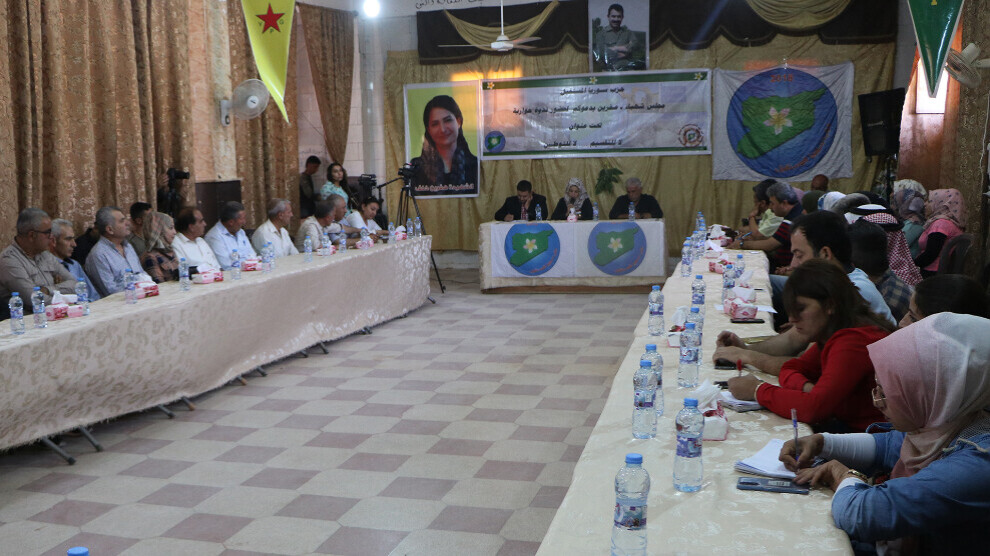 Şehba - Di bin navê "Na ji parçekirinê re, na ji guhertina demografîk re" Partiya Sûriye Demokratîk a herêma Efrînê komxebatek li hola Çand û Huner a navçeya Fafînê ya Kantona Şehbayê li dar xistin. Di komxebatê de Hemû endamên sazî û dezgehên Rêveberiya Xweser amede bûn. Hol bi alên Partiya Suriye Demokratîk, wêneya pekrewan Hevrîn Xelef hatibû xemilandin. Komxebat bi deqeyek rêzgirtin ji bo cangoriyên azadiyê dest pê kir. Piştre komxebat ji aliyê Xezal Elo ve hat rêve birin, piştre jî belge hatin xwendin.