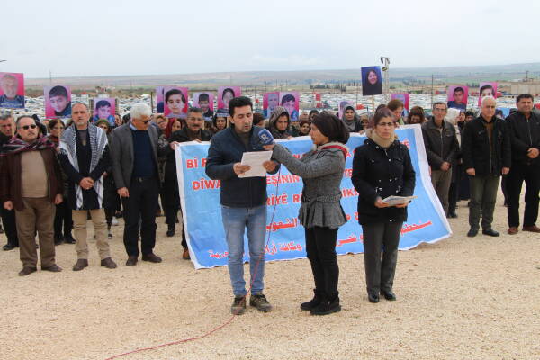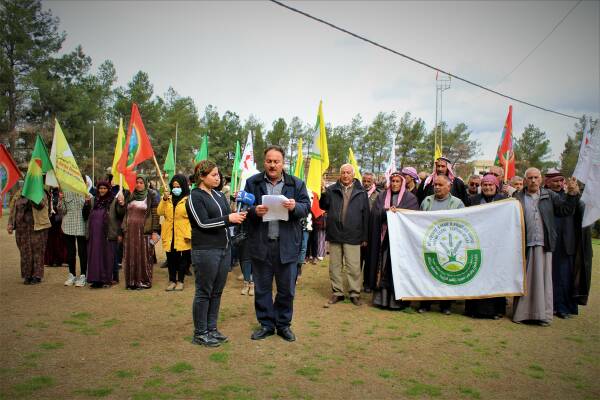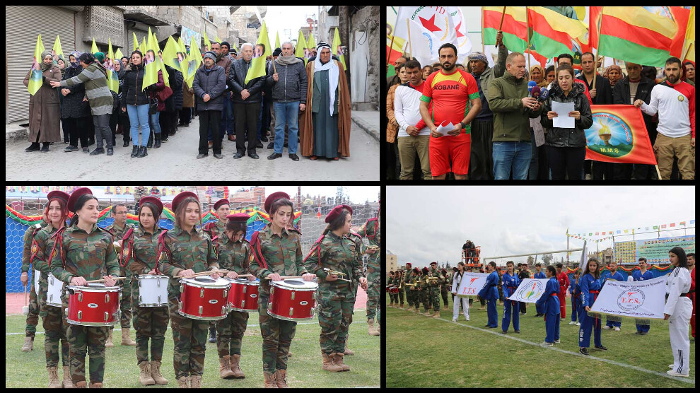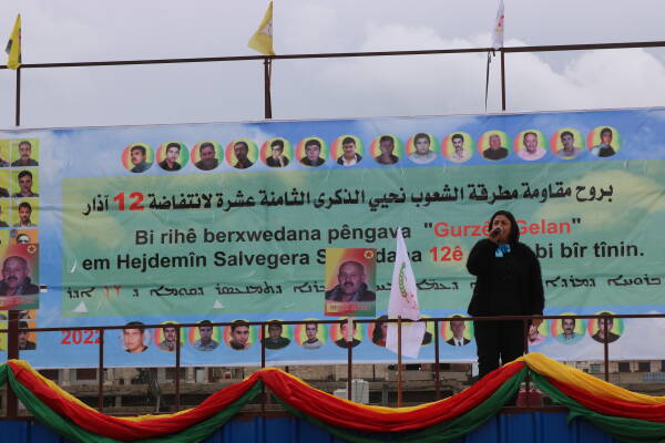 Bi dehan ji endam û xebatkarên Rêveberiya Xweser, Tevgera Civaka Demokratîk (TEV-DEM), partiyên siyasî, Yekitiya Jinên Ciwan û Tevgera Ciwanên Şoreşger, Meclisa Malbatên Şehîdan û Hêzên Parastina Cewherî li lîstikgeha Hevaltiya Kobanê û Nerwêcê ya Desteya Ciwan û Werzîşê kom bûn û ji bo salvegera serhildana Qamişloyê daxuyanî dan.