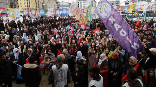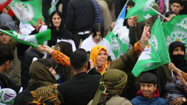 Qada Newrozê bi alên Partiya Wekhevî û Demokrasiyê ya Gelan (DEM Partî), flamayên kesk, sor û zer hatiye xemilandin. Welatî di deriyekî de dikevin qada Newrozê û coşa pîrozbahiyê her ku diçe zêdetir dibe.