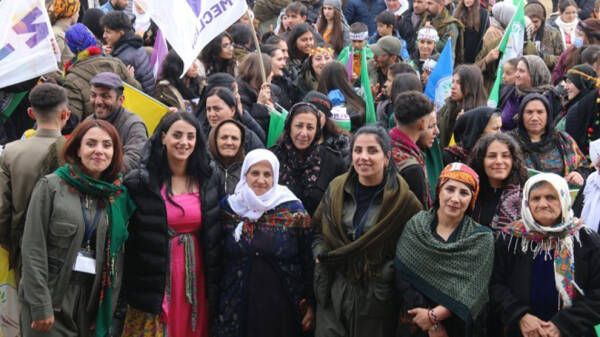 Welatiyên ku bi komî, bi nîşaneyên serkeftinê û dirûşma "Bijî Newroz" dikevin qadê, bi flamayên Partiya Wekhevî û Demokrasiyê ya Gelan (DEM Partî) ketin qadê rengîn dikin. Li noqteya lêgerîna ya polîsan ji bo rengên kesk, sor û zer destûr nehat dayîn û li ser îsrara gel, bi hezaran kes bi dirûşmên "Bijî Serok Apo", "Jin Jiyan Azadî" û "Bijî berxwedana zindanan" meşê li dar xistin.