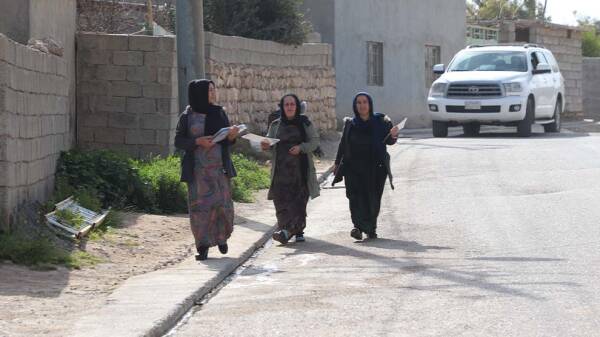 Meclîsa Îştar ya Wargeha Penaberan a Şehîd Rustem Cudî (Mexmûr) di çarçoveya rêzeçalakiyên 8'ê Adarê Roja Jinên Kedkar a Cîhanê de li kolanên Mexmûrê belavokan belav kirin.