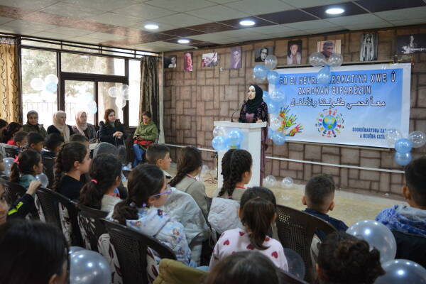 Qamişlo- Ofîsa Jin a Tevgera Civaka Demokratîk Tev-Dem bi boneya Roja Zarokan a Cîhanî ya ku dikeve 20’ê mijdarê çalakiyek ji zarokên ku di ku di pîşesazî û bazara sebzeyan de dixebitin, li bajarê Qamişlo- Bakur û Rojhilatê Sûriyeyê di bin dirûşmeya “Em bi hev re zarokatiya xwe û zarokan bibarêzin” lidarxist. Di çalakiyê de bi dehan zarok beşdar bûn, tê de helbest, stran hatin pêşkêşkirin û diyarî li ser zarokan hatin belavkirin.