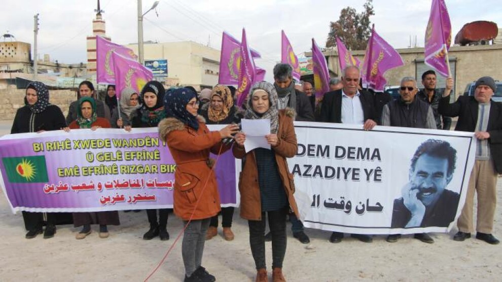 Şehba- Meclisa Jinên Azad a Şehbayê bi rasthatina salvegera 4’emîn a êrîşên dewleta tirk a dagirker li ser Efrînê daxuyanî li pêşiya saziya Mala Jin a navçeya Fafînê ya girêdayî kantona Şehbayê da. Di daxuyaniyê de endamên Meclisa Jin û Kongra Star amade bûn. Daxuyanî ji aliyê endama Meclisa Jinên Azad a Şehbayê Şêrîn Elîmo ve hat xwendin.
