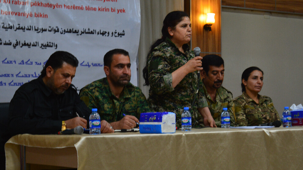 Qamişlo - Dewleta tirk a dagirker di êrîşên xwe de hemû gelê herêmê dike armanc bê ku tu ferq bike navbera pêkhatiyan. Yekrêziya gelê herêmê li dijî vê yekê dikaribû heya niha nirxên şoreşa gelan biparêze. Di komcivîna rûsipiyên êlên eşîran de ya ku li dijî kiryar, êrîş û dagirkeriya dewleta tirk li ser herêmê hate lidarxistin. Endama Meclisa Leşkerî ya bajarê Qamişlo Bêrîtan Mihemed gef û êrîşên dewleta tirk li ser herêmê nirxand.