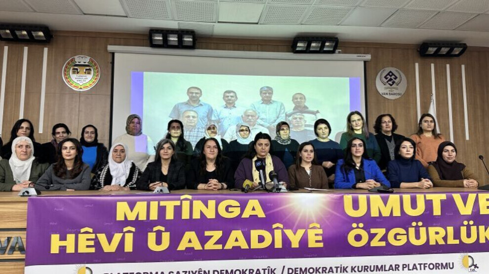 Wan – Di 4'ê Çileyê de ji aliyê Platforma Saziyên Demokratîk ve li Amedê bi daxwaza azadiya Rêberê Gelê Kurd Abdullah Ocalan mitînga "Hêvî û azadiyê" bê lidarxistin. Derbarê mîtîngê de Tevgera Jinên Azad (TJA) li Baroya Wanê civîna çapemeniyê li dar xist. Ji bilî aktîvîstên TJA'yê, pêkhateyên Platforma Jinan a Wanê, Komeleya Jinan a Star, Kooperatîfa Jinan, Meclîsa Dayikên Aştiyê û rêxistinên demokratîk beşdarî civînê bûn. Metna bi kurdî a daxuyaniyê ji hêla aktîvîsta TJA'yê Felek Erdem, metna tirkî jî ji hêla aktîvîsta TJA'yê Hatîce Oktay ve hat xwendin.