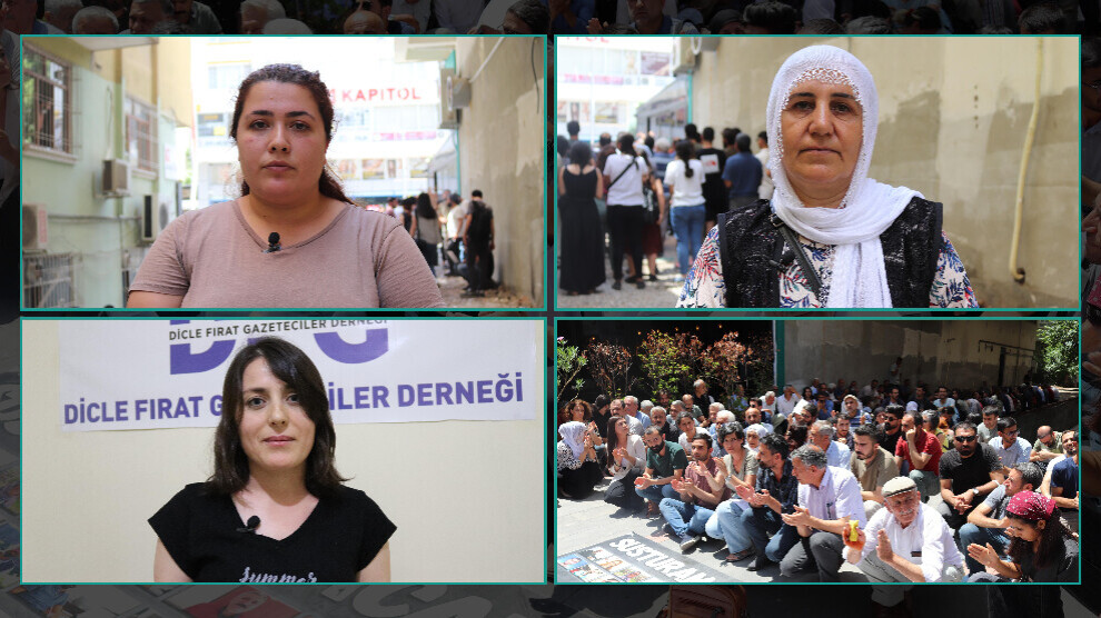 Amed- Ji bo 7 jê jin û 20 jê rojnameger 22 kesên ku di 8'ê hezîranê de li Amedê bi serdegirtina malan de hatin binçavkirin, du roj berê ji bo îfadeya li dozgeriyê sewqî Edliyeyê hatin kirin. Rojnamegerên ku piştî 8 rojan di hucreyên yek kesî de hatin girtin, îfadeyên wan yên ji dazgeriyê hat girtin, îfadeyên ku danê sibê hatin girtin heta sibeha roja din dom kir. Dema ji 22 kesên ku îfadeya wan ya dozgeriyê hat girtin yek bi şertê kontrola edlî hat berdan, yên din jî bi daxwaza girtinê sewqî dadgehê hatin kirin. 16 jê rojnamegerên ku di Dadgeha Sulh Cezayê de bi îdiaya "endama rêxistinê" darizandin hatin girtin û şandin girtîgehê.